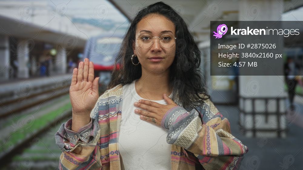 Woman raising right hand and left hand on chest at outdoor train station platform beside tracks, wearing glasses and patterned jacket; oath sincerity.