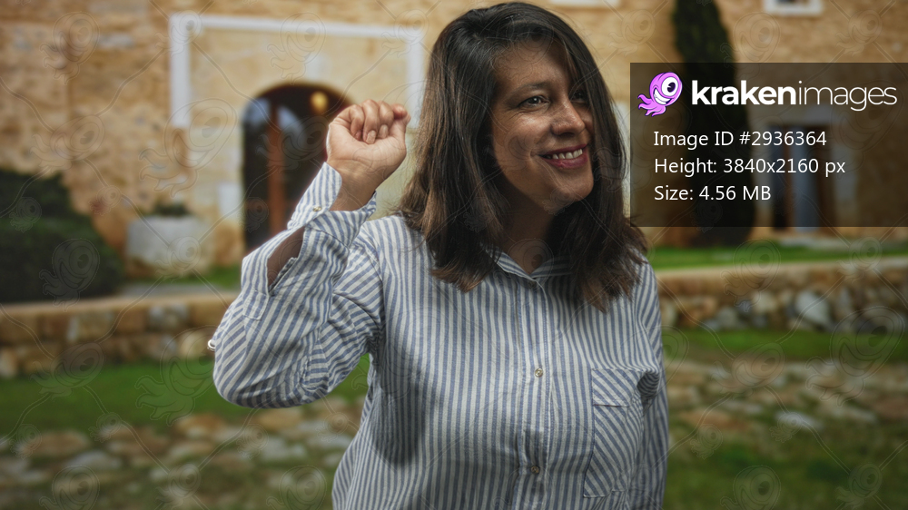 Woman raising right hand near face wearing striped shirt in front of stone building entrance and garden wall; confidence reflection.