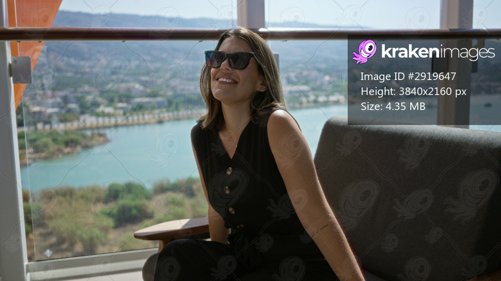 Woman reaching for straw bag on cruise ship terrace near railing and chair; vacation leisure serenity.