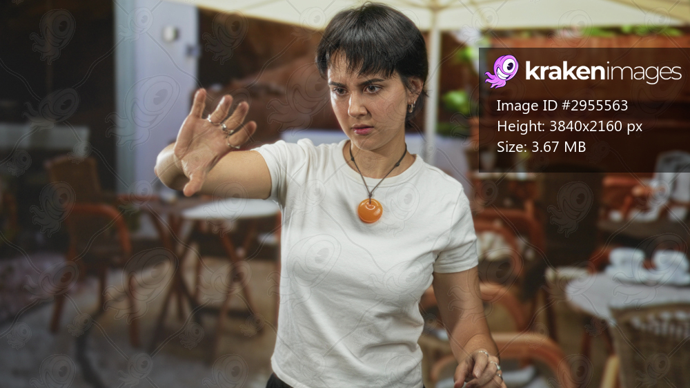 Woman reaching forward with hand toward invisible interface wearing orange pendant at outdoor cafe; concentration mindful practice.