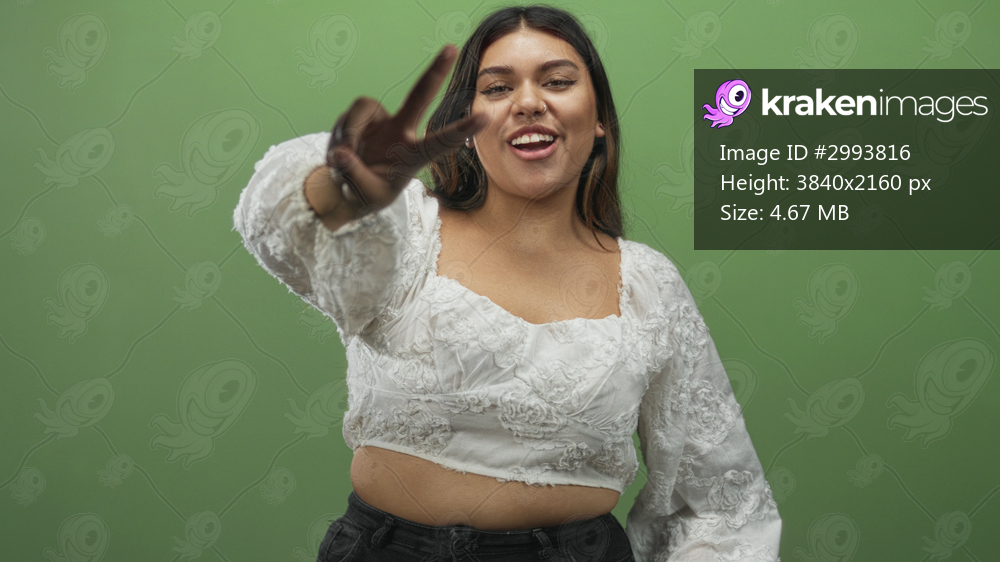 Woman reaching hand forward flashing a peace sign, wearing white embroidered crop top in studio; playful confidence.
