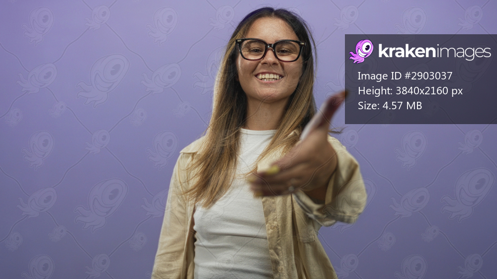 Woman reaching out hand to camera smiling and wearing glasses and light shirt in studio with purple backdrop; warmth invitation.