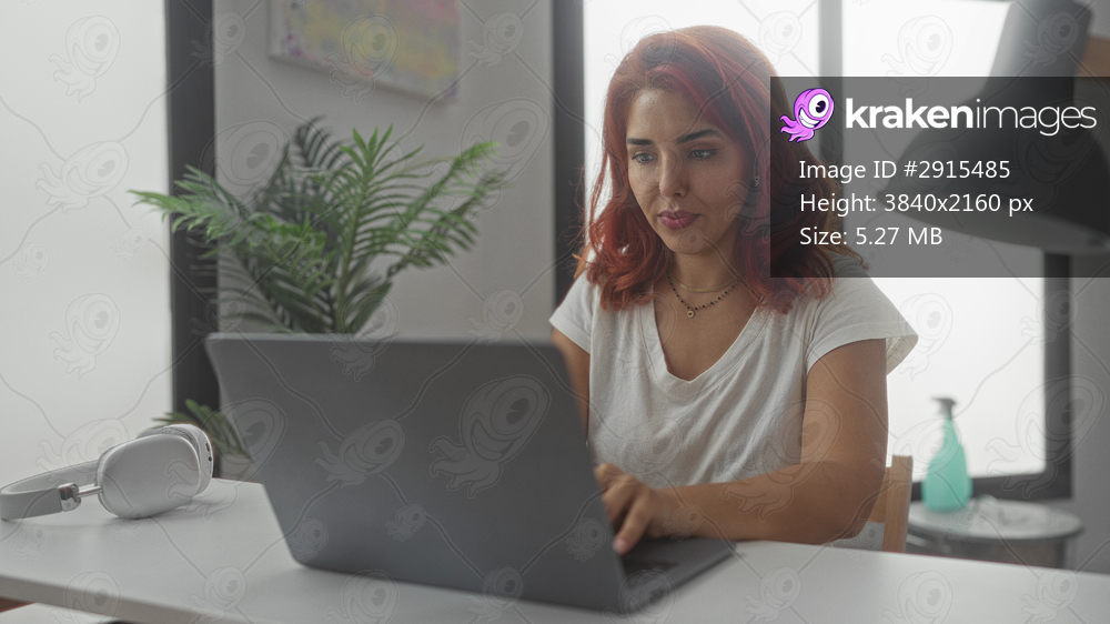 Woman reaching to close a laptop on a white desk in a home studio with headphones and lamp visible; remote work concentration.