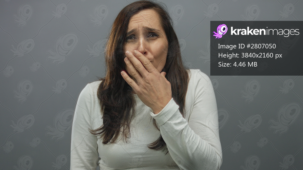 Woman reacting with hand on mouth wearing white shirt in front of grey wall expressing shock or surprise young and hispanic