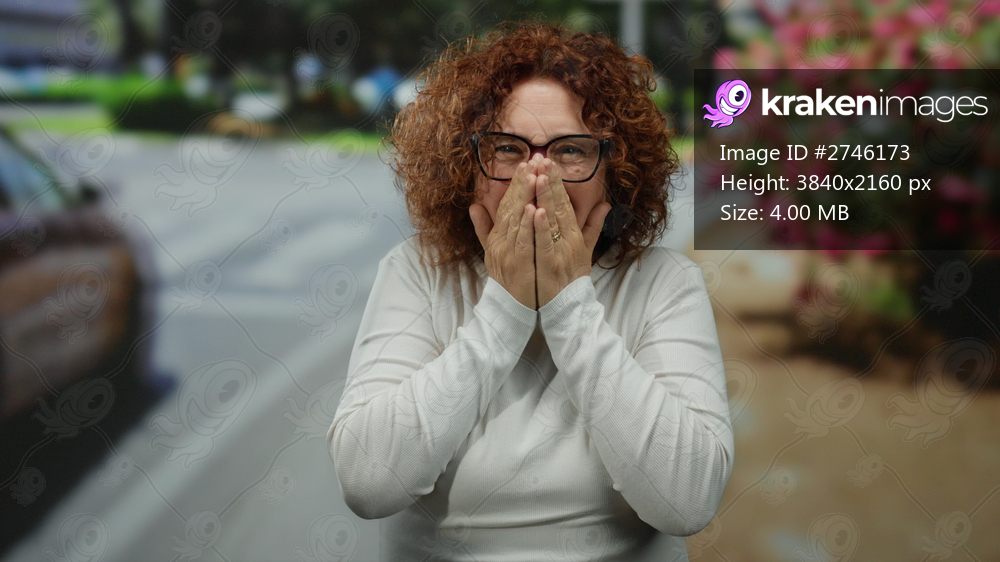 Woman reacting with joy outdoors in an urban street setting, surrounded by city life, expressing happiness and excitement in a vibrant outdoor environment. - Kraken Images