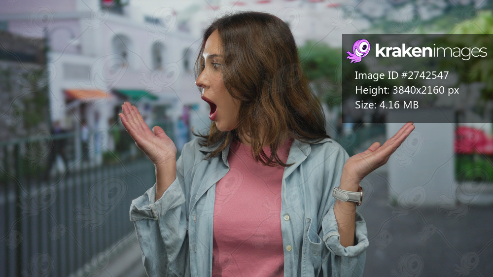 Woman reacts outdoors on city street showcasing surprise expression with urban backdrop emphasizing youthful excitement