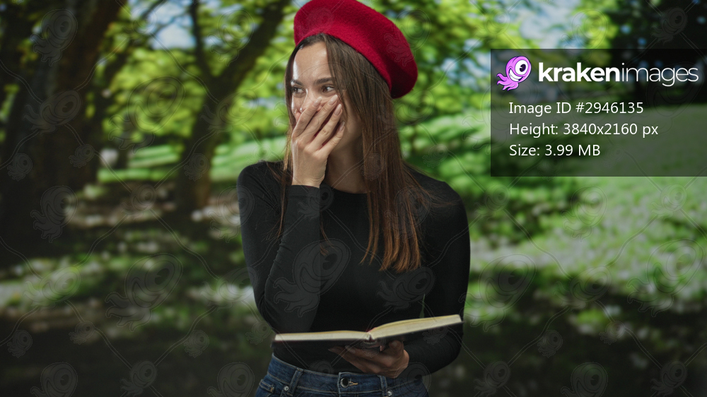 Woman reading a book, smiling with hand to mouth and hands holding pages, wearing red beret and jeans in forest; bookish joy.