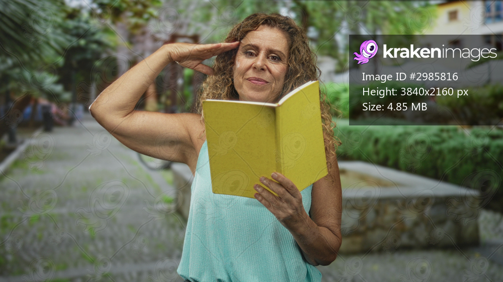 Woman reading a yellow book salutes with her right hand on a street, holding the open book at chest level and smiling; confidence inspiration.