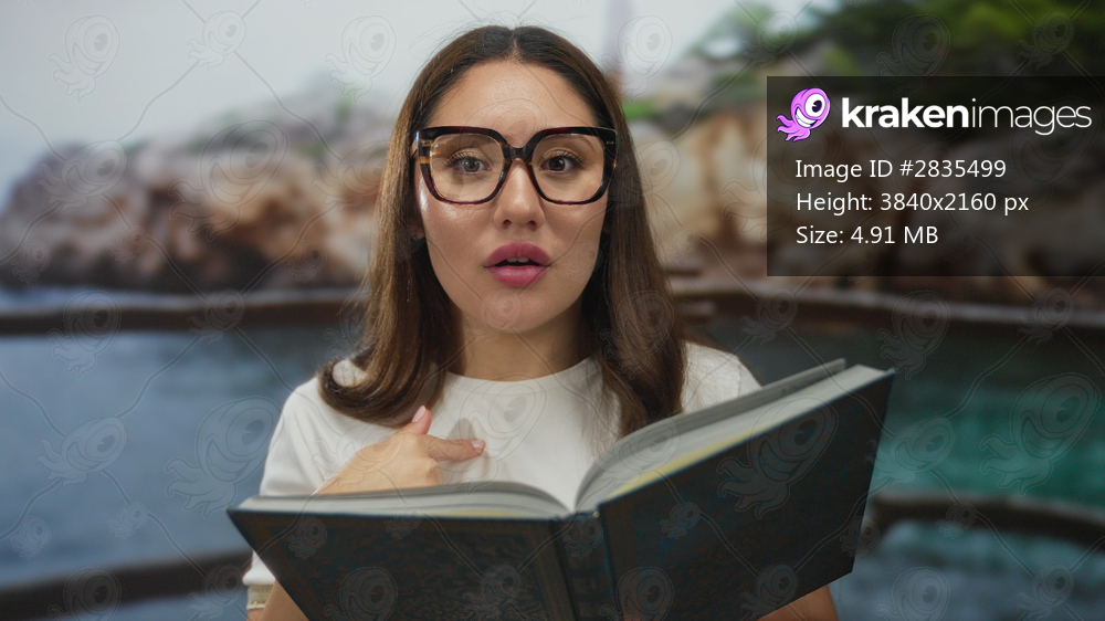 Woman reading book and adjusting glasses at rocky seaside beach with turquoise water behind her and flipping pages; serenity reflection.