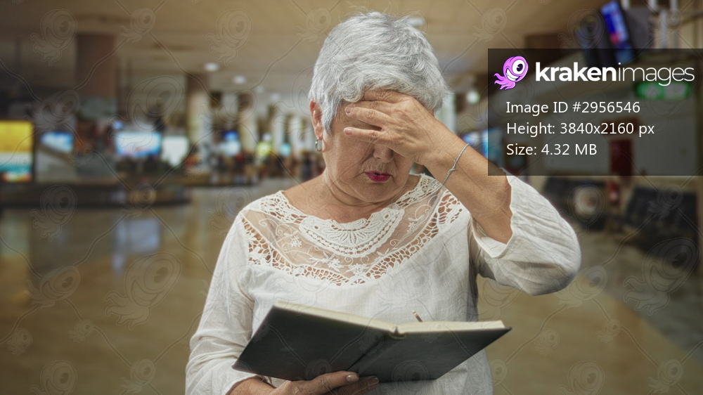 Woman reading book, holding it with both hands and touching temple for headache in airport terminal baggage area; travel delay fatigue.