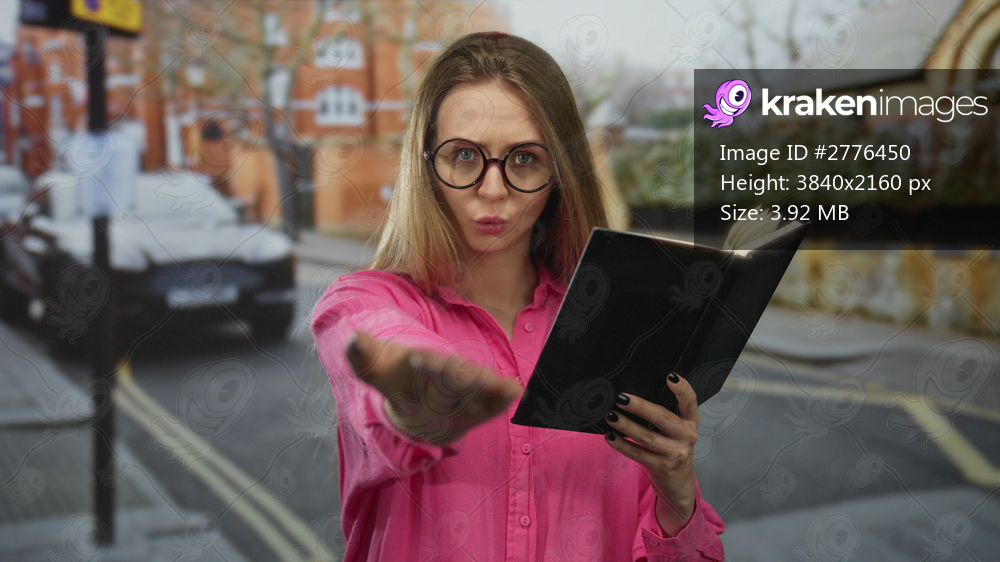 Woman reading book on city street outdoors wearing pink shirt glasses surrounded urban scenery showing hand gesture focused expression
