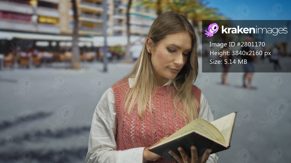 Woman reading book on sunny street in city with people walking in the background, featuring blonde hair and casual outfit