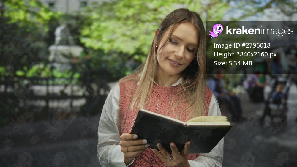 Woman reading book outdoors in park surrounded by greenery and people enjoying free time