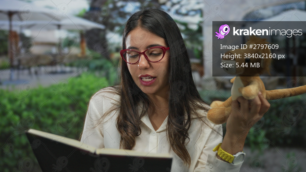 Woman reading book with stuffed lion at outdoor restaurant terrace, wearing red glasses and white shirt, sunny weather, greenery and umbrellas in background. - Kraken Images