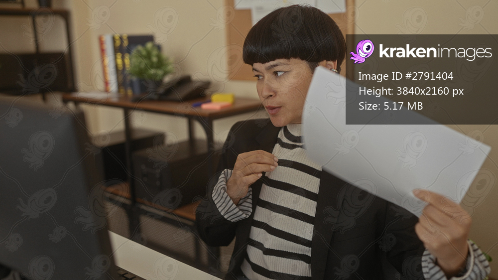 Woman reading document in office setting with modern furniture, computer, books, and plants, suggesting a focused work environment.