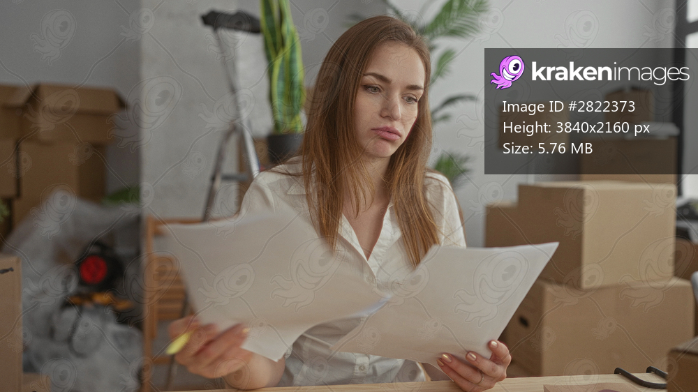 Woman reading documents with pencil and flipping pages inside building surrounded by packed boxes and ladder; uncertainty.
