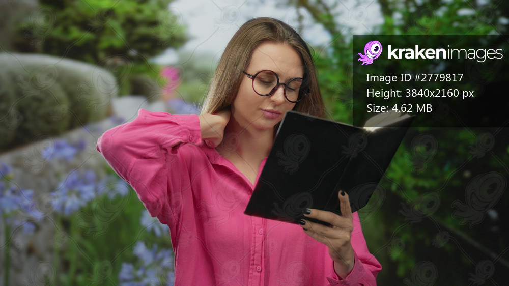 Woman reading in a park, wearing glasses and pink shirt, surrounded by greenery and flowers on a sunny day, enjoying outdoor relaxation.