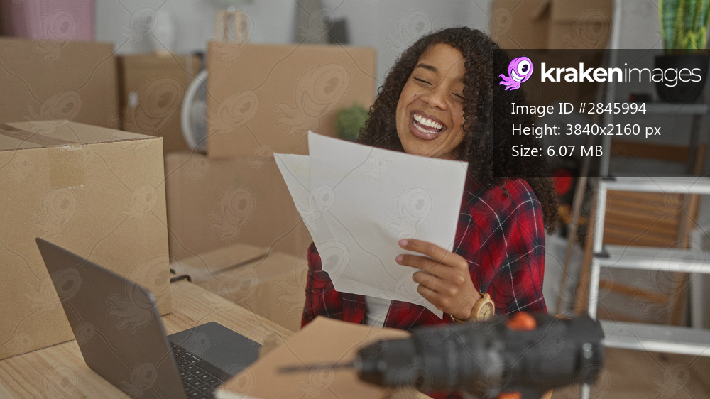 Woman reading paper at office desk with laptop, stacked boxes and ladder in office building; excitement accomplishment.
