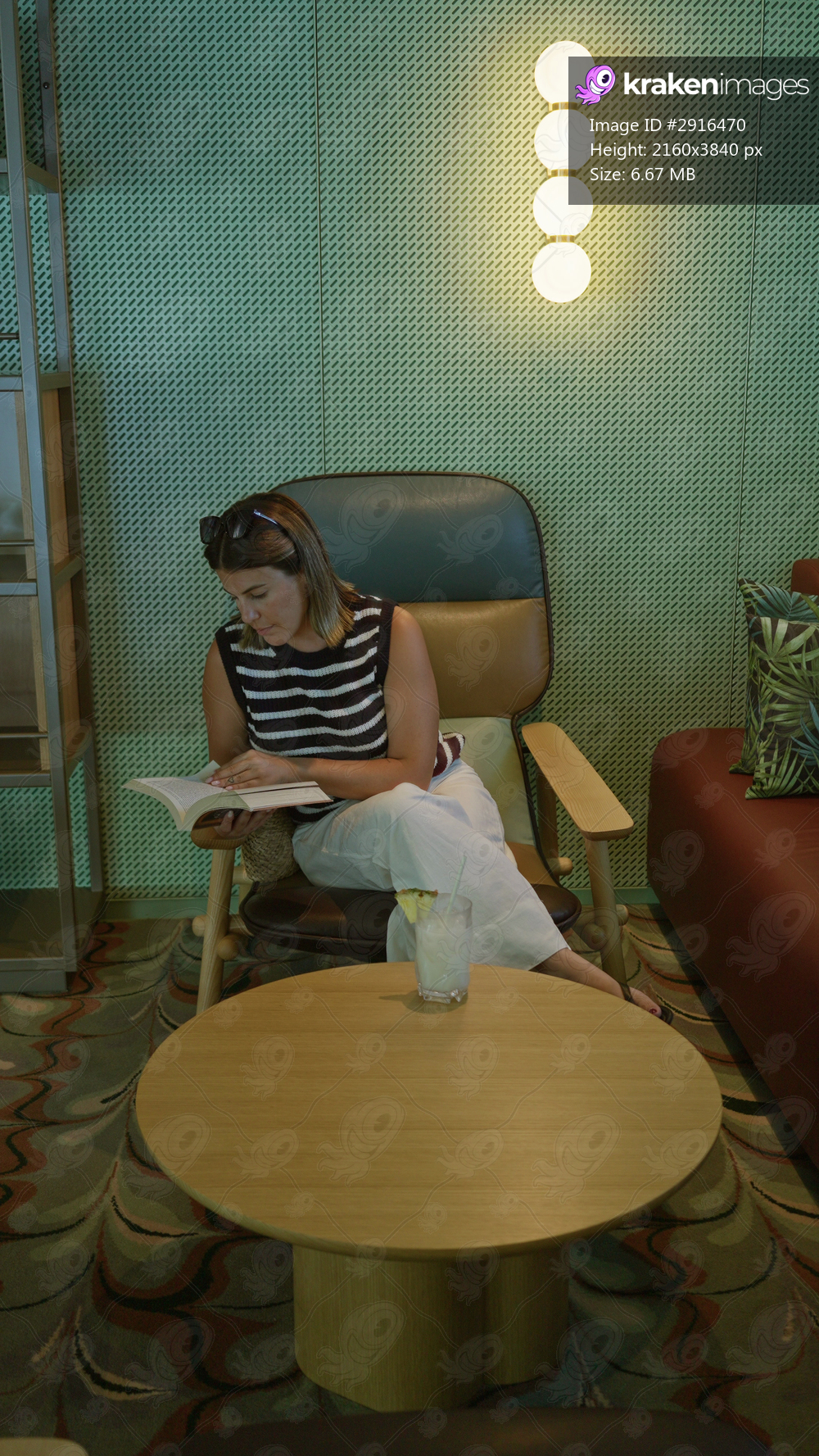 Woman reads book and points finger to page while seated on armchair at table in building; leisure calm.