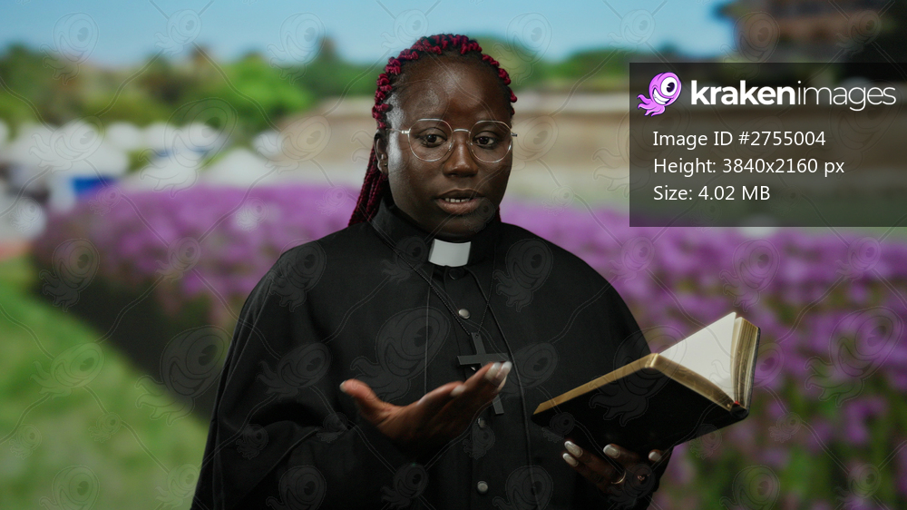Woman reads religious book outdoors in park setting surrounded by flowers and green landscape, focusing on spirituality and serenity in a peaceful environment. - Kraken Images