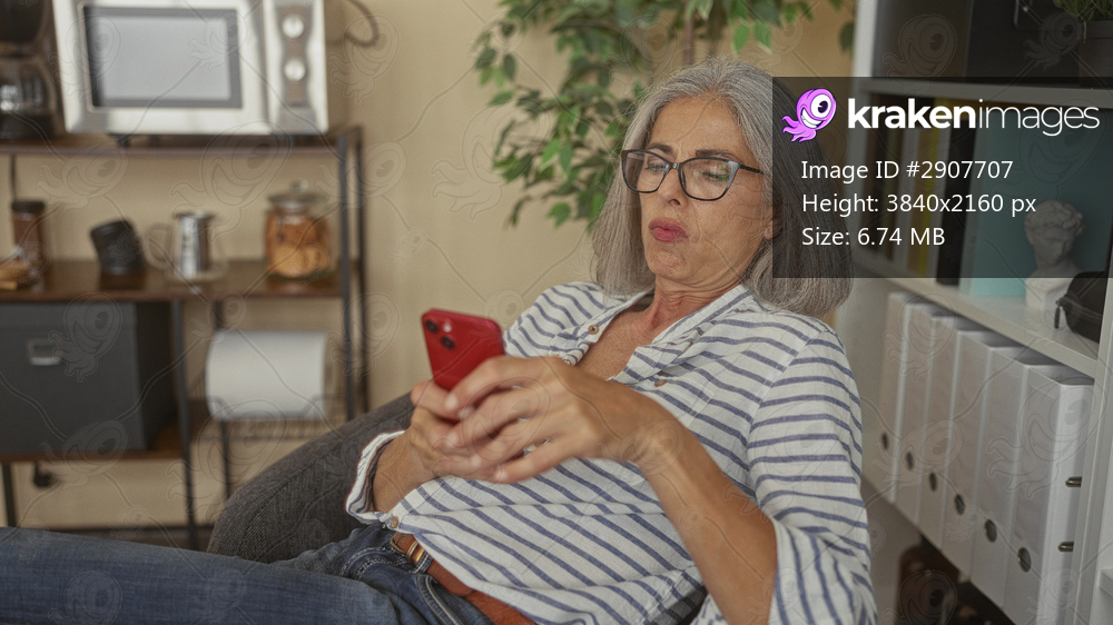 Woman reclining in office scrolling a red smartphone with hands on screen and glasses on, surrounded by shelves and binders; annoyance distraction.