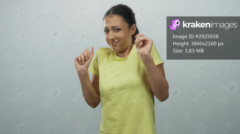 Woman recoiling with hands raised, grimacing expression wearing yellow t shirt in pale gray studio; disgust.