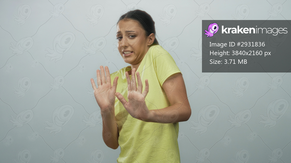 Woman recoiling with hands raised, grimacing expression wearing yellow t shirt in pale gray studio; disgust.