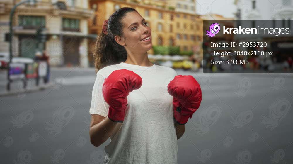 Woman with red boxing gloves holding fists up in a busy city street plaza; confidence empowerment fitness.