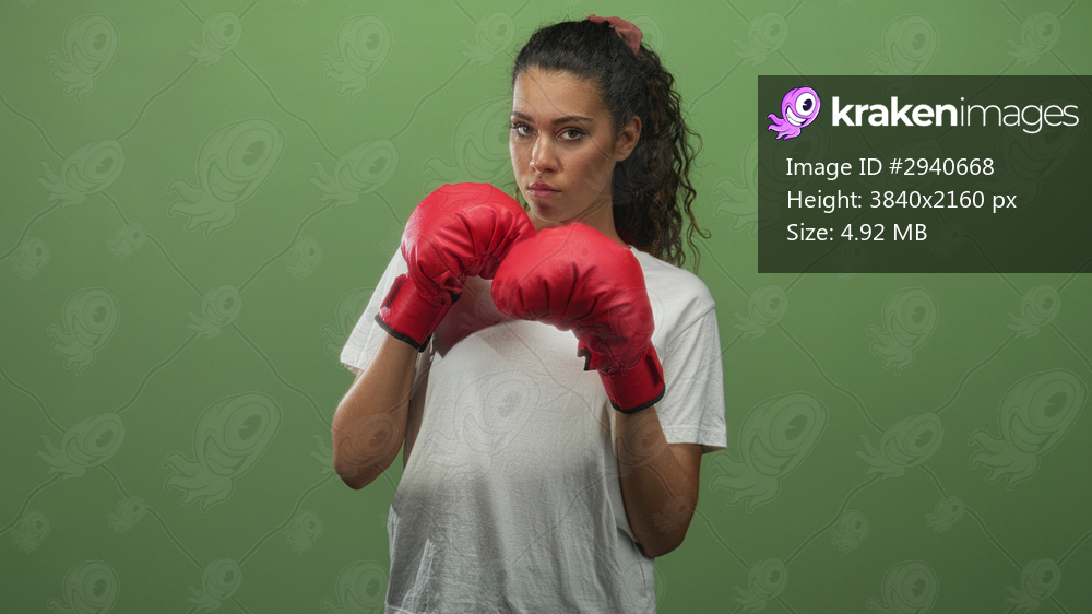 Woman with red boxing gloves holding fists up in studio wearing white t shirt and ponytail in guarded boxing stance facing camera; determination grit focus. - Kraken Images