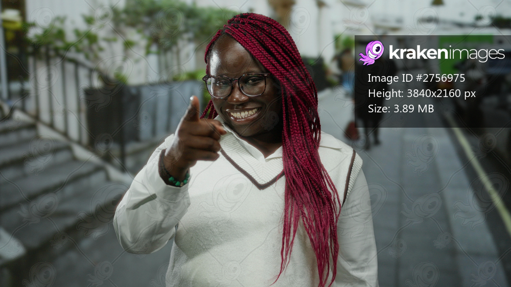 Woman with red braids and glasses smiling and pointing at the camera on a city street outdoors.