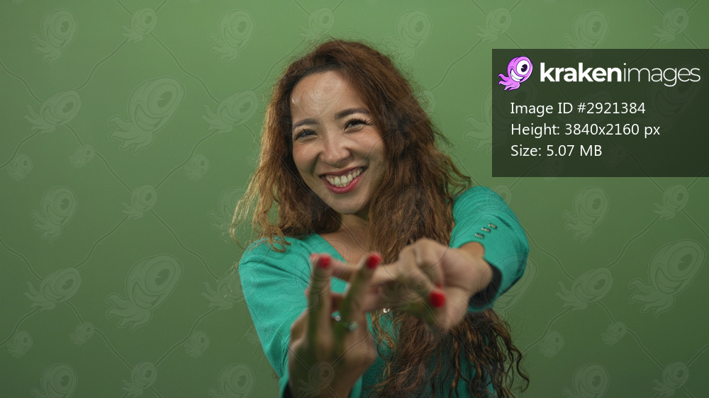 Woman with red fingernails making a finger framing hashtag gesture in studio with green background; playful energy.