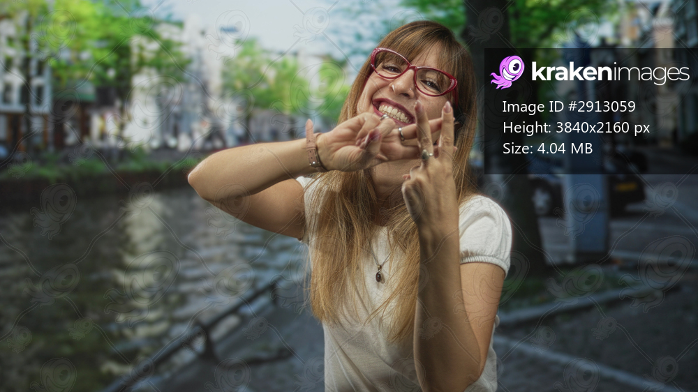Woman with red glasses forming a hashtag with fingers while smiling on an amsterdam street canal walkway, hands forward and rings visible; playful connection. - Kraken Images