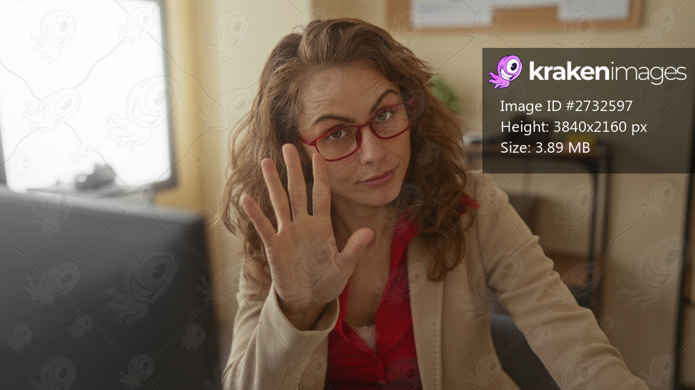 Woman with red glasses gestures in an office setting, emphasizing a point with hand gestures, creating a professional yet expressive atmosphere, perfect for workplace communication themes. - Kraken Images
