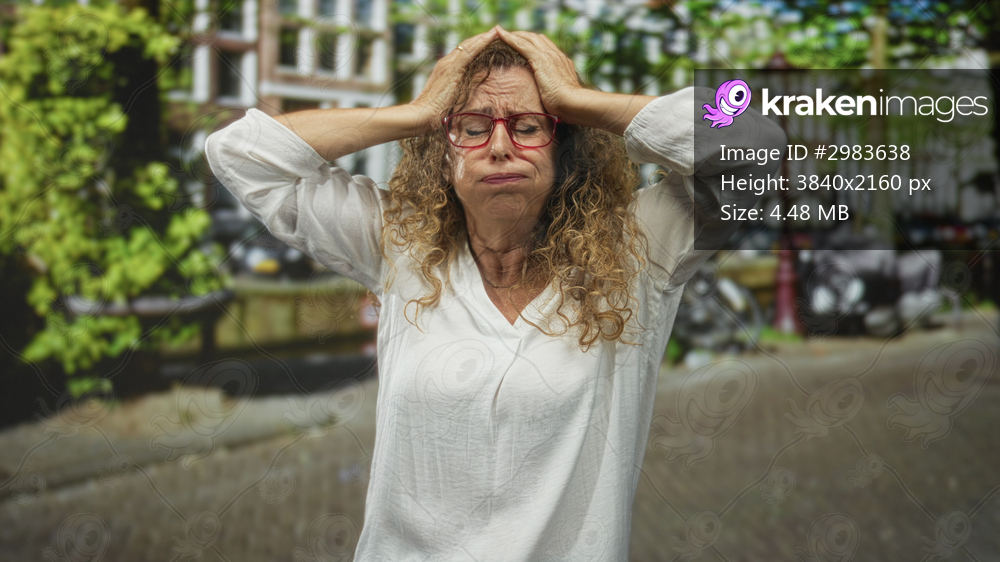 Woman with red glasses holding head with both hands on a cobblestone street, white blouse and tense mouth; stress fatigue.