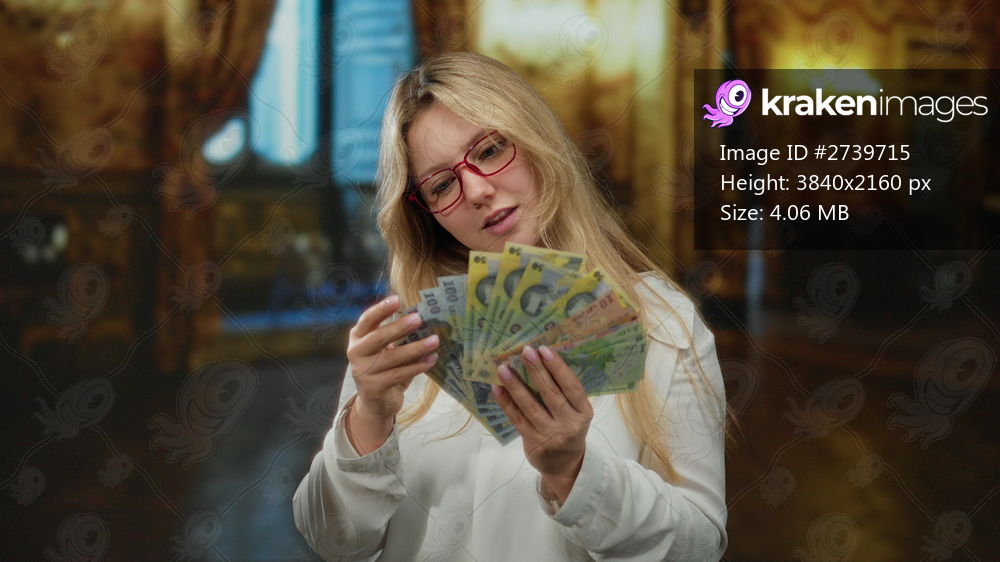 Woman with red glasses holding romanian banknotes in ornate indoor museum setting.