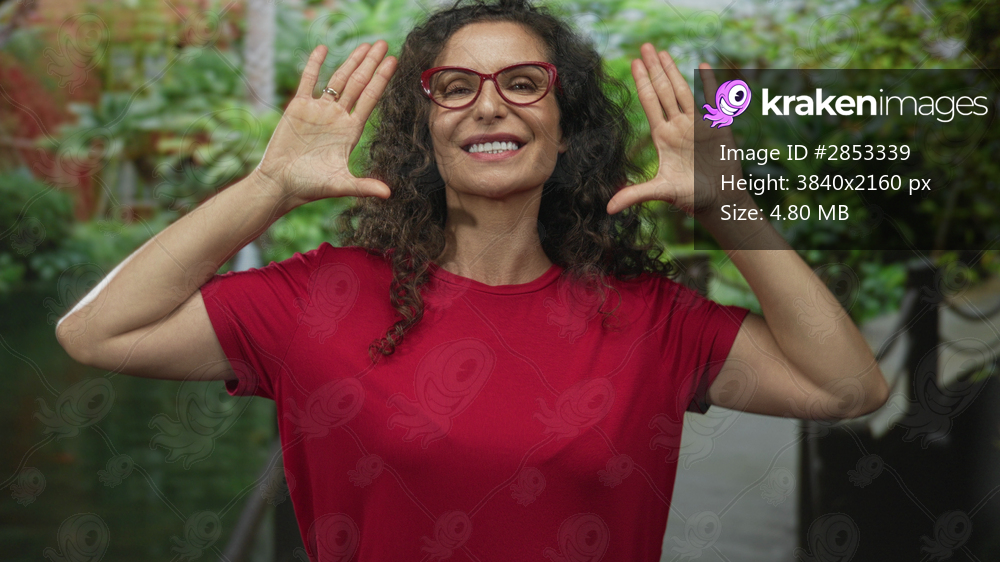 Woman with red glasses playfully framing her face with both hands and smiling in forest; playful joy.