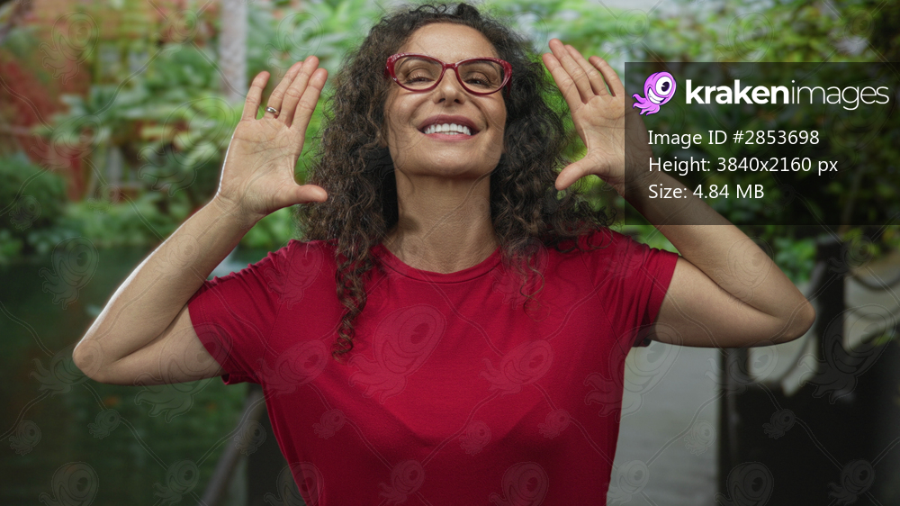 Woman with red glasses playfully framing her face with both hands and smiling in forest; playful joy.