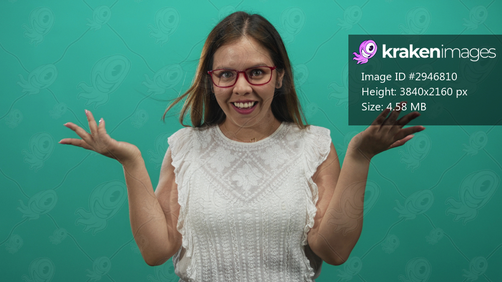 Woman with red glasses pointing finger in studio against teal backdrop wearing white lace blouse, direct gesture; assertive challenge.