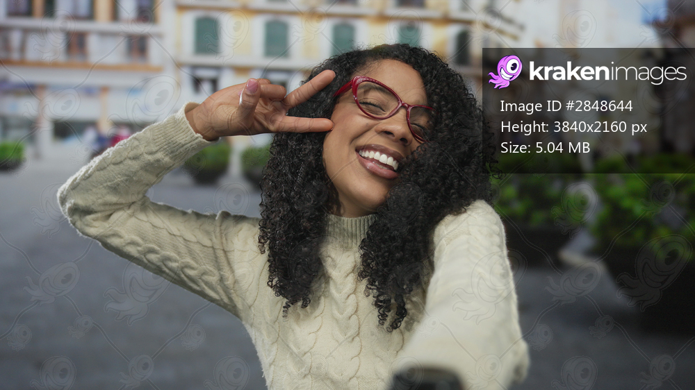 Woman with red glasses pointing hand at camera on urban city street wearing cream sweater and smartwatch; joy engagement connection positivity.