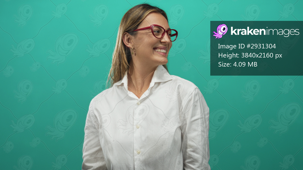 Woman with red glasses smiling and looking sideways in teal studio; confidence approachable friendly professional.