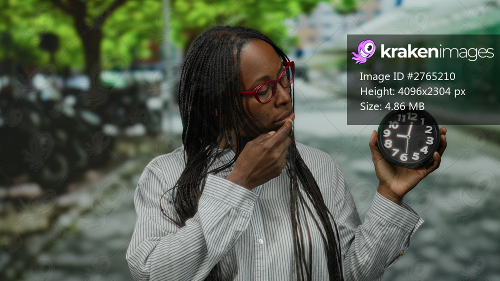 Woman with red glasses and striped shirt holds a clock while standing on an urban street with green trees, evoking a thoughtful expression and time management theme. - Kraken Images