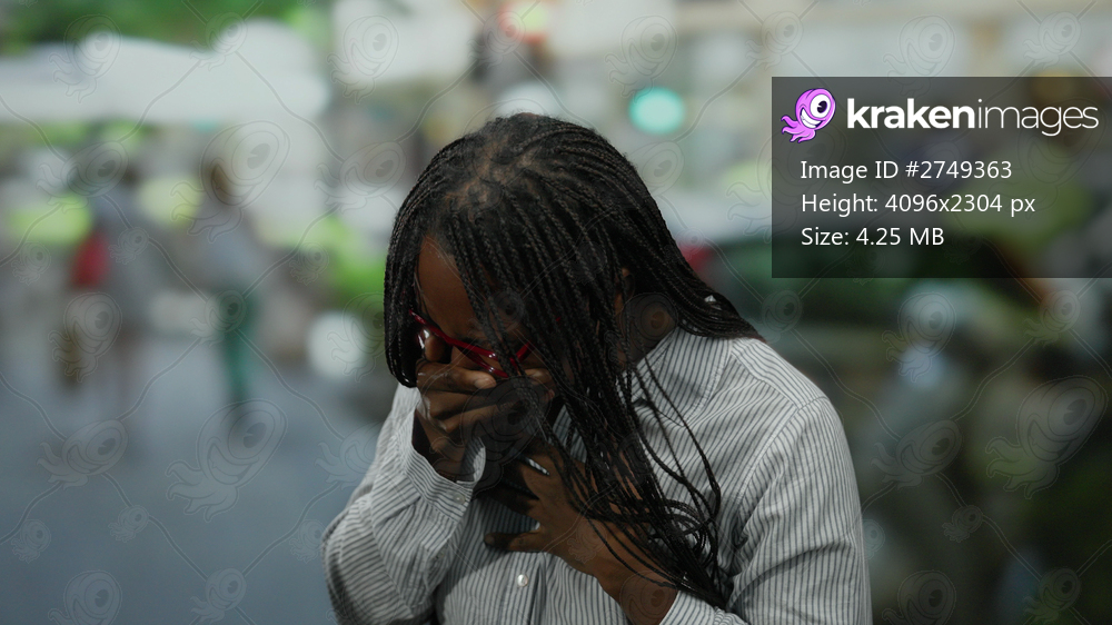 Woman with red glasses touching chest on urban street with blurred cars and people background highlighting outdoor city atmosphere.