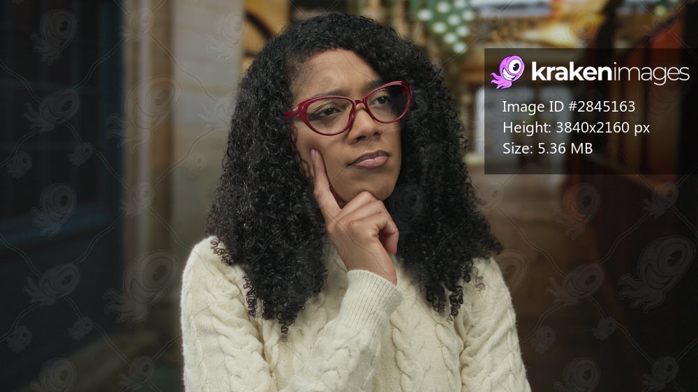 Woman with red glasses touching chin for thinking in building under soft light; curiosity reflection thought.