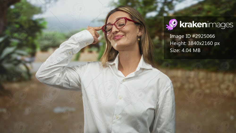 Woman with red glasses touching temple with finger on a street near building, wearing white shirt and slight smile; confidence thinking.