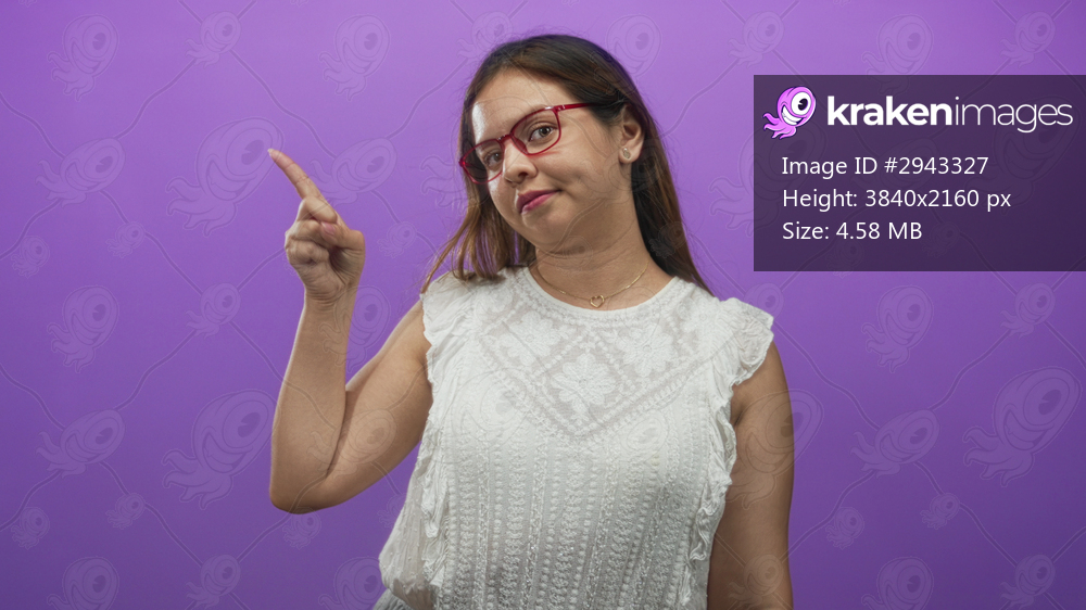 Woman with red glasses and white lace blouse raising two fingers in a peace sign in a purple studio; confidence peace.