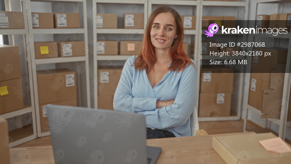 Woman with red hair at a desk using a laptop among stacked cardboard boxes, arms crossed and slight smile in a warehouse packing room; confidence entrepreneurship. - Kraken Images