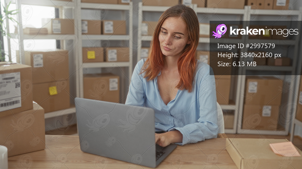 Woman with red hair at a desk using a laptop among stacked cardboard boxes, arms crossed and slight smile in a warehouse packing room; confidence entrepreneurship. - Kraken Images