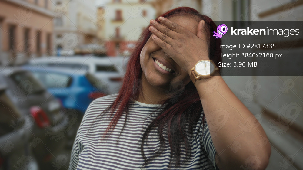 Woman with red hair covering her eyes with her hand in a candid moment on a city street lined with parked cars; shyness.