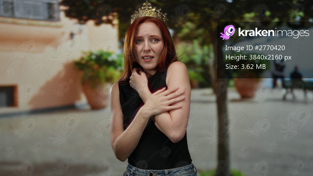 Woman with red hair and crown looks anxious in city street setting with trees.
