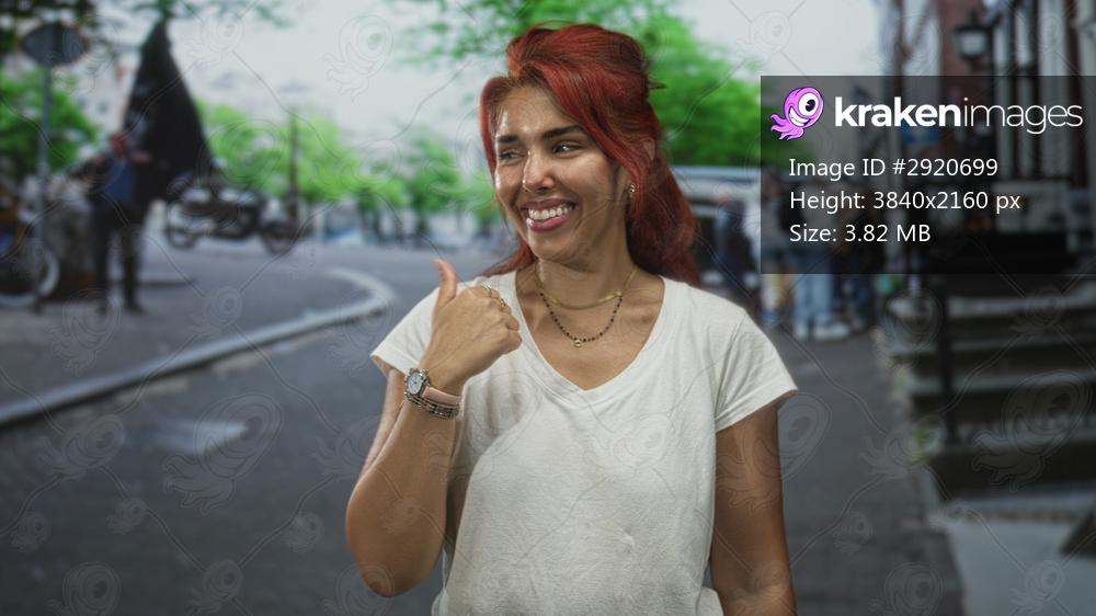 Woman with red hair giving thumbs up showing bare thumb and wristwatch on a street near building steps and blurred pedestrians; confidence.